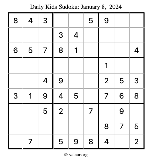 Kids Sudoku January 8, 2024 is not the only sudoku puzzle we have. We create a new kids sudoku puzzle every day for you to print and solve. Check out today's kids sudoku puzzle here!