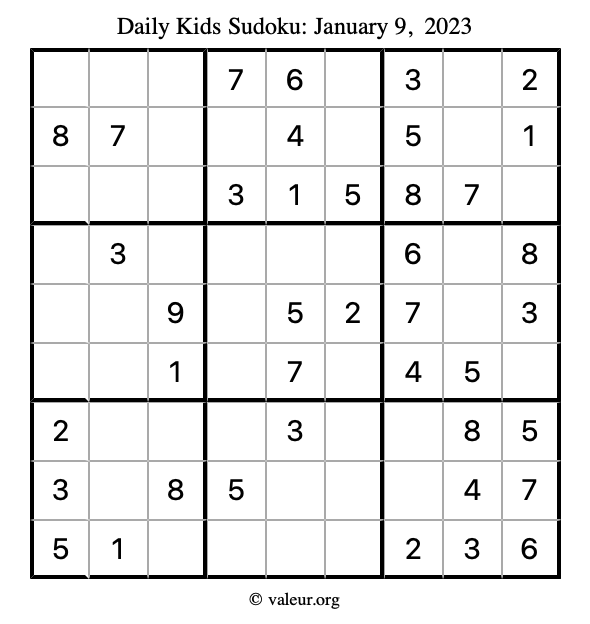 Kids Sudoku January 9, 2023 is not the only sudoku puzzle we have. We create a new kids sudoku puzzle every day for you to print and solve. Check out today's kids sudoku puzzle here!