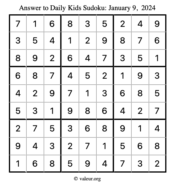 Here is the January 9, 2024 kids sudoku puzzle. You are welcome to print a copy to solve by hand. For your convenience, we have also included the solution further down the page so you can check your work.