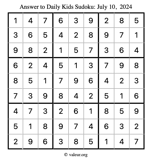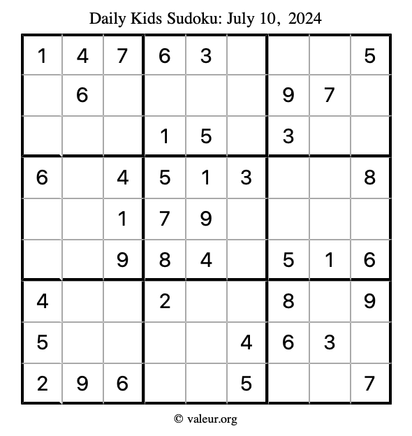 Here is the July 10, 2024 kids sudoku puzzle. You are welcome to print a copy to solve by hand. For your convenience, we have also included the solution further down the page so you can check your work.