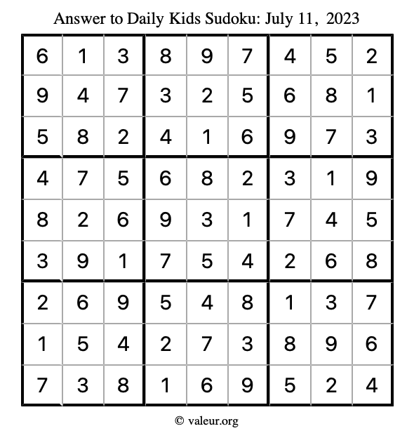 Here is the July 11, 2023 kids sudoku puzzle. You are welcome to print a copy to solve by hand. For your convenience, we have also included the solution further down the page so you can check your work.