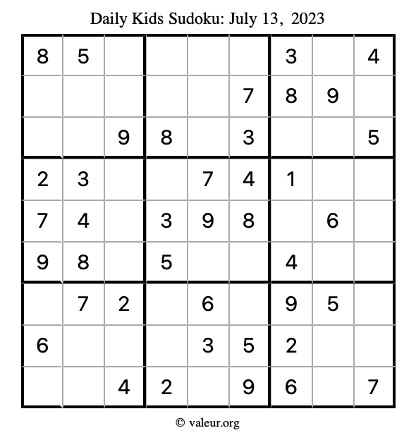 Kids Sudoku July 13, 2023 is not the only sudoku puzzle we have. We create a new kids sudoku puzzle every day for you to print and solve. Check out today's kids sudoku puzzle here!