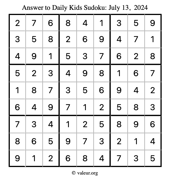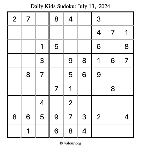 Here is the July 13, 2024 kids sudoku puzzle. You are welcome to print a copy to solve by hand. For your convenience, we have also included the solution further down the page so you can check your work.