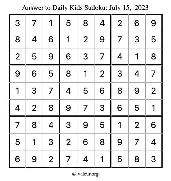 Here is the July 15, 2023 kids sudoku puzzle. You are welcome to print a copy to solve by hand. For your convenience, we have also included the solution further down the page so you can check your work.