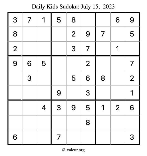 Kids Sudoku July 15, 2023 is not the only sudoku puzzle we have. We create a new kids sudoku puzzle every day for you to print and solve. Check out today's kids sudoku puzzle here!