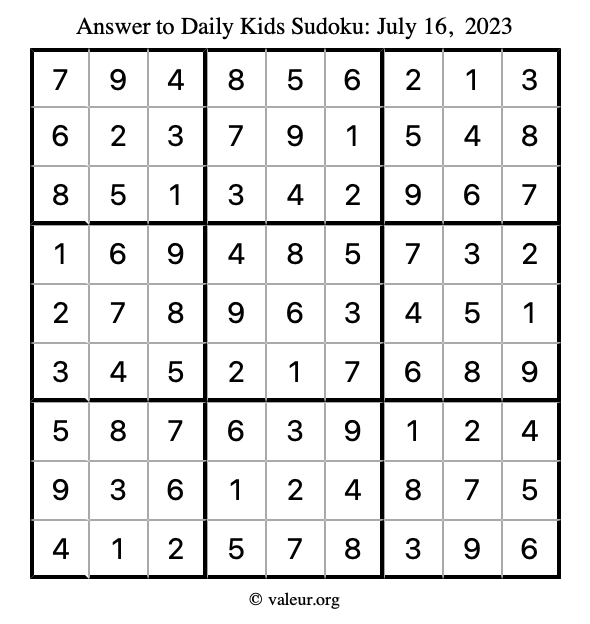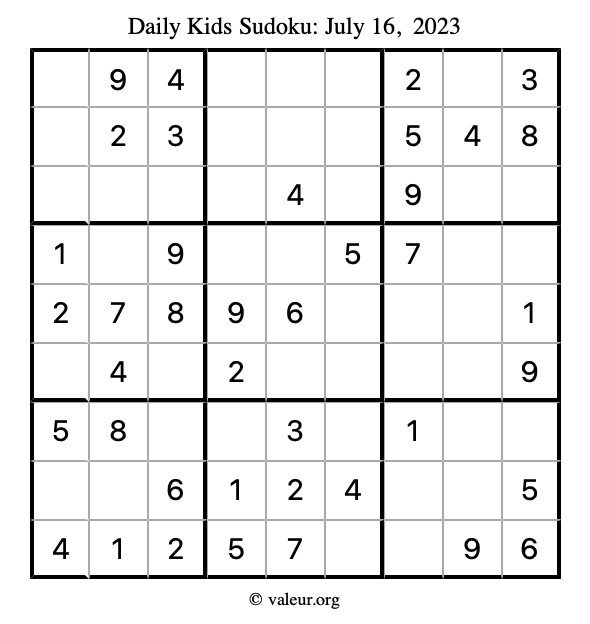 Here is the July 16, 2023 kids sudoku puzzle. You are welcome to print a copy to solve by hand. For your convenience, we have also included the solution further down the page so you can check your work.