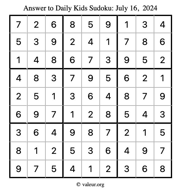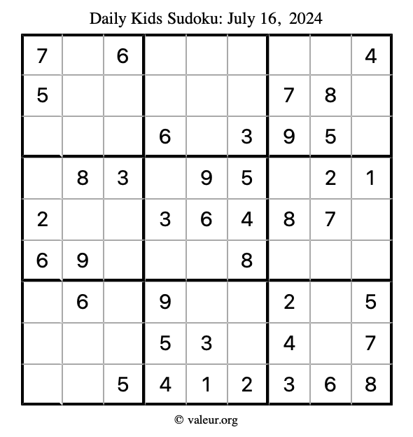 Here is the July 16, 2024 kids sudoku puzzle. You are welcome to print a copy to solve by hand. For your convenience, we have also included the solution further down the page so you can check your work.