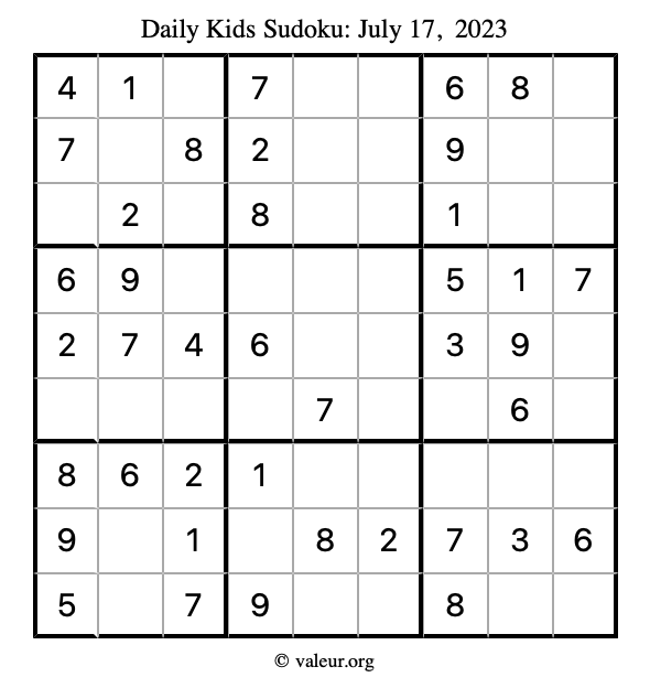 Kids Sudoku July 17, 2023 is not the only sudoku puzzle we have. We create a new kids sudoku puzzle every day for you to print and solve. Check out today's kids sudoku puzzle here!