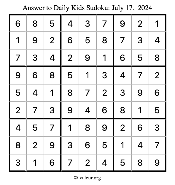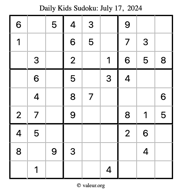 Here is the July 17, 2024 kids sudoku puzzle. You are welcome to print a copy to solve by hand. For your convenience, we have also included the solution further down the page so you can check your work.