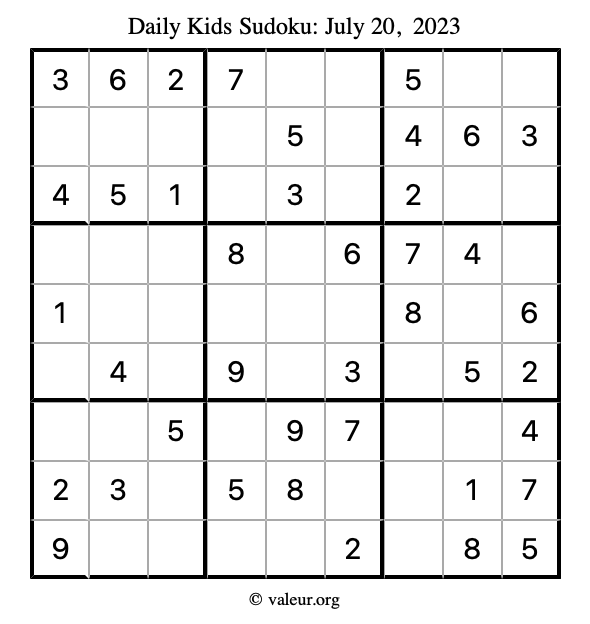 Here is the July 20, 2023 kids sudoku puzzle. You are welcome to print a copy to solve by hand. For your convenience, we have also included the solution further down the page so you can check your work.