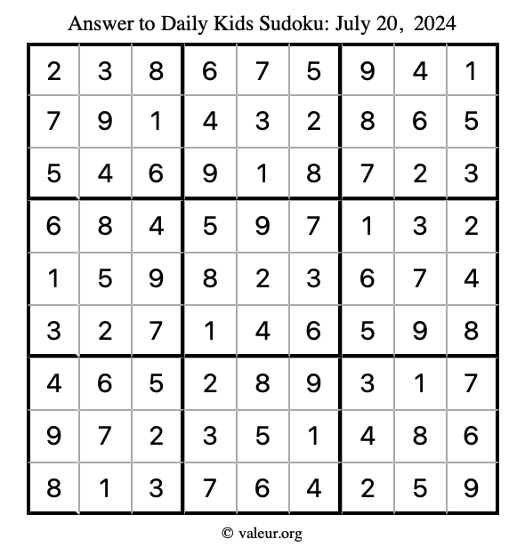 Here is the July 20, 2024 kids sudoku puzzle. You are welcome to print a copy to solve by hand. For your convenience, we have also included the solution further down the page so you can check your work.