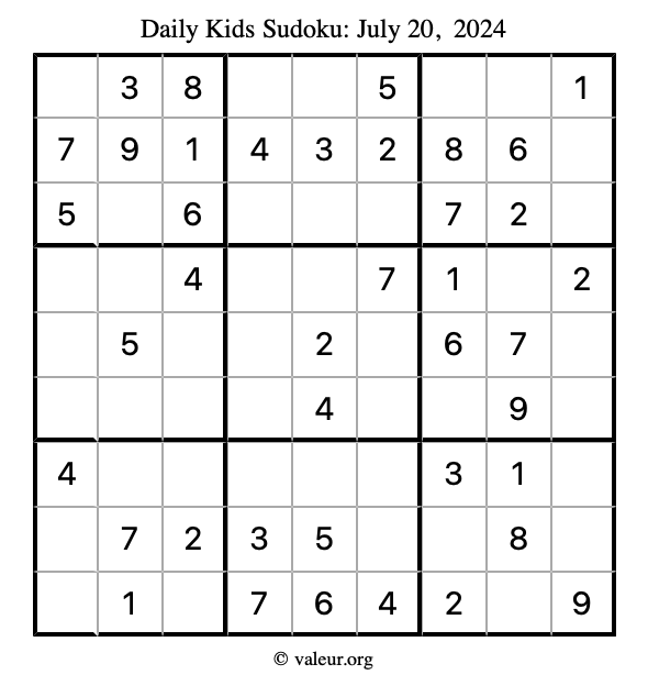 Kids Sudoku July 20, 2024 is not the only sudoku puzzle we have. We create a new kids sudoku puzzle every day for you to print and solve. Check out today's kids sudoku puzzle here!