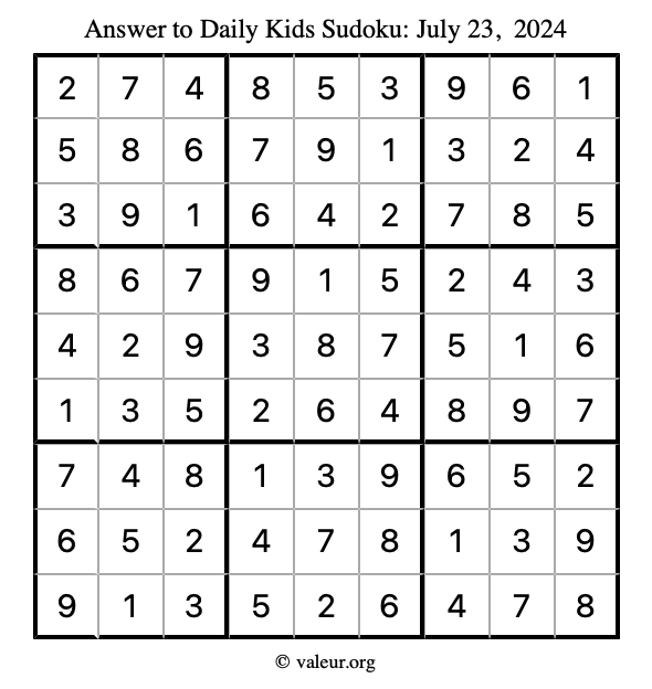Here is the July 23, 2024 kids sudoku puzzle. You are welcome to print a copy to solve by hand. For your convenience, we have also included the solution further down the page so you can check your work.