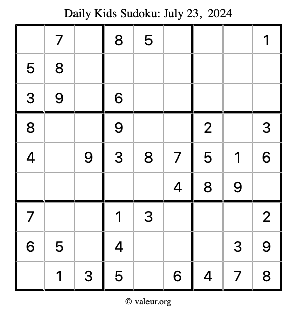 Kids Sudoku July 23, 2024 is not the only sudoku puzzle we have. We create a new kids sudoku puzzle every day for you to print and solve. Check out today's kids sudoku puzzle here!