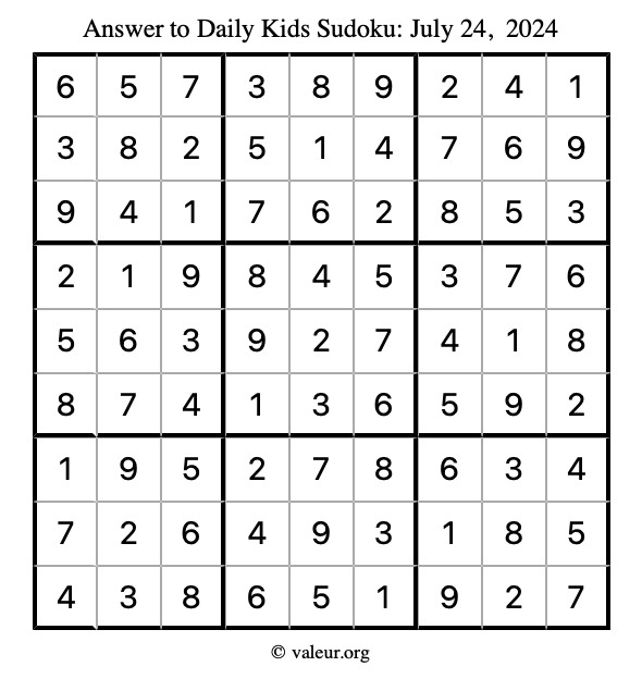 Here is the July 24, 2024 kids sudoku puzzle. You are welcome to print a copy to solve by hand. For your convenience, we have also included the solution further down the page so you can check your work.