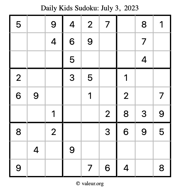 Here is the July 3, 2023 kids sudoku puzzle. You are welcome to print a copy to solve by hand. For your convenience, we have also included the solution further down the page so you can check your work.