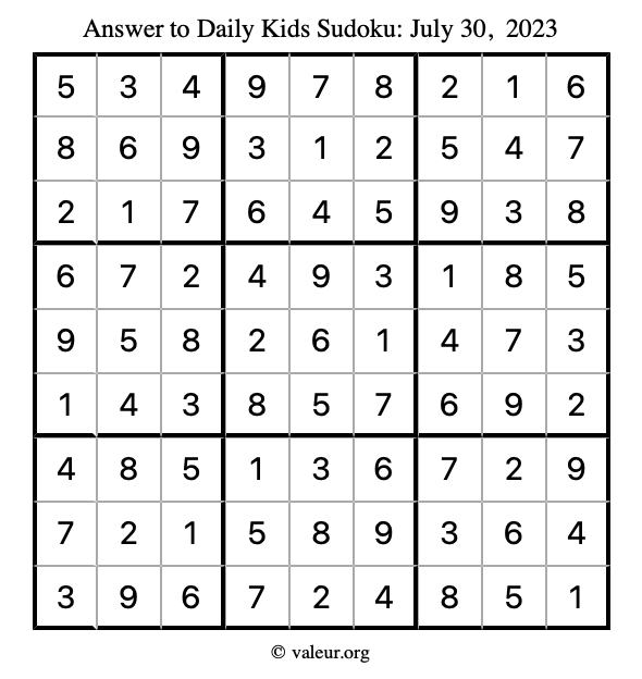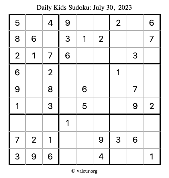Here is the July 30, 2023 kids sudoku puzzle. You are welcome to print a copy to solve by hand. For your convenience, we have also included the solution further down the page so you can check your work.
