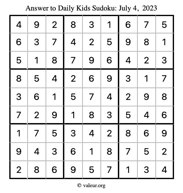 Kids Sudoku July 4, 2023 is not the only sudoku puzzle we have. We create a new kids sudoku puzzle every day for you to print and solve. Check out today's kids sudoku puzzle here!