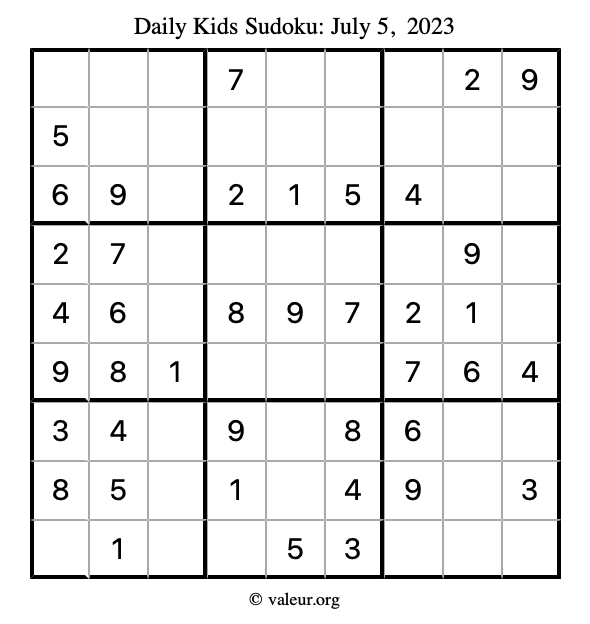 Kids Sudoku July 5, 2023 is not the only sudoku puzzle we have. We create a new kids sudoku puzzle every day for you to print and solve. Check out today's kids sudoku puzzle here!
