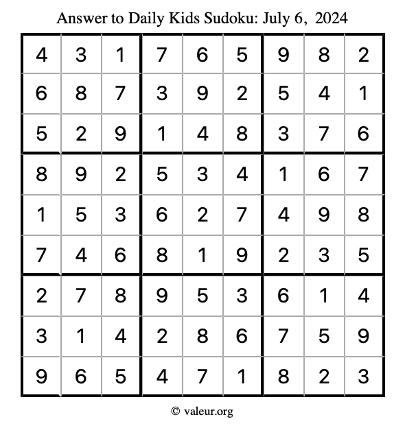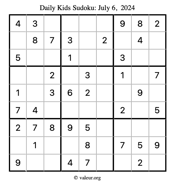 Here is the July 6, 2024 kids sudoku puzzle. You are welcome to print a copy to solve by hand. For your convenience, we have also included the solution further down the page so you can check your work.