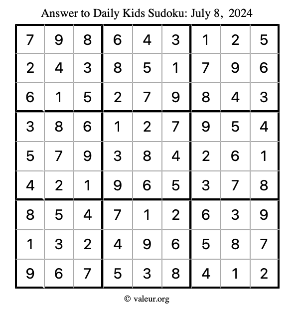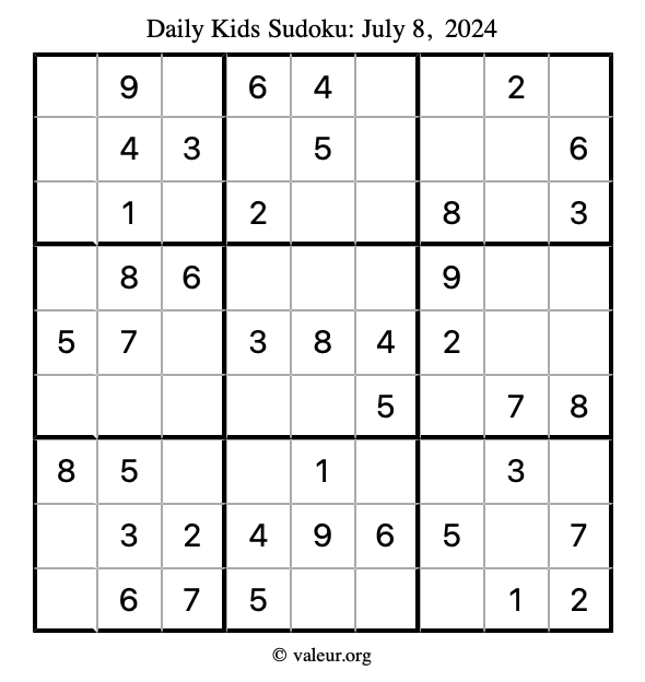 Here is the July 8, 2024 kids sudoku puzzle. You are welcome to print a copy to solve by hand. For your convenience, we have also included the solution further down the page so you can check your work.