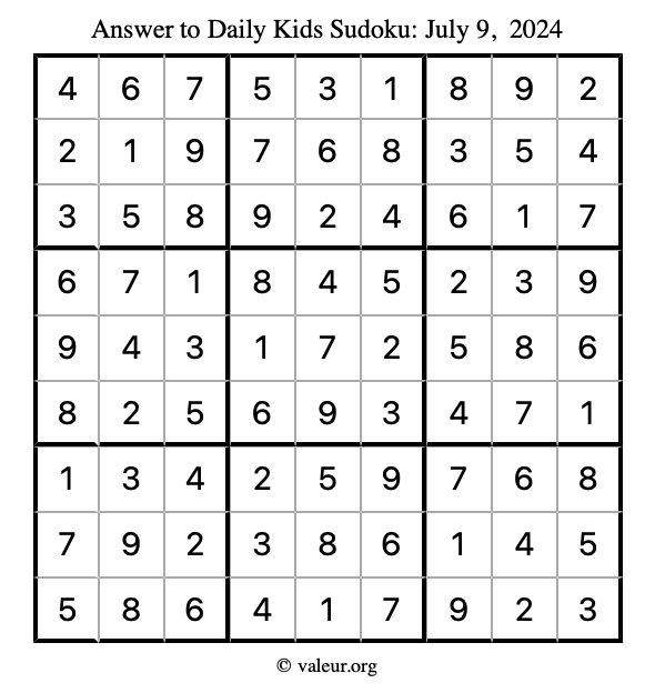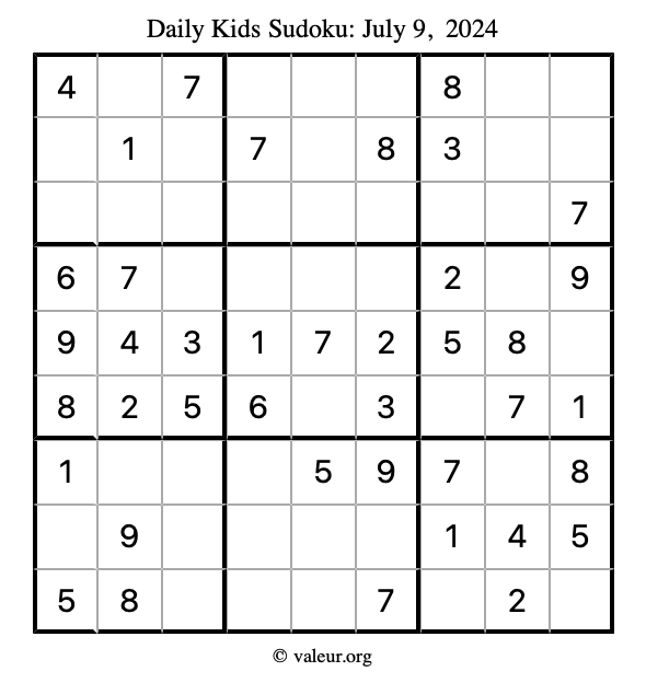 Here is the July 9, 2024 kids sudoku puzzle. You are welcome to print a copy to solve by hand. For your convenience, we have also included the solution further down the page so you can check your work.