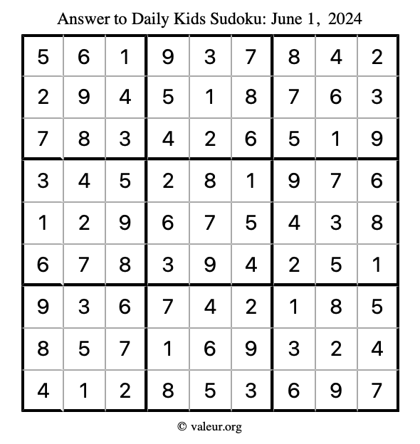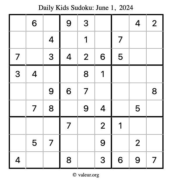 Here is the June 1, 2024 kids sudoku puzzle. You are welcome to print a copy to solve by hand. For your convenience, we have also included the solution further down the page so you can check your work.