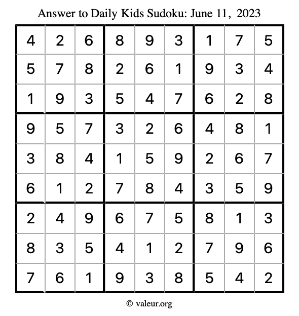 Here is the June 11, 2023 kids sudoku puzzle. You are welcome to print a copy to solve by hand. For your convenience, we have also included the solution further down the page so you can check your work.
