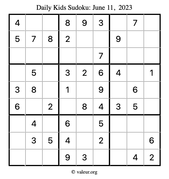 Kids Sudoku June 11, 2023 is not the only sudoku puzzle we have. We create a new kids sudoku puzzle every day for you to print and solve. Check out today's kids sudoku puzzle here!