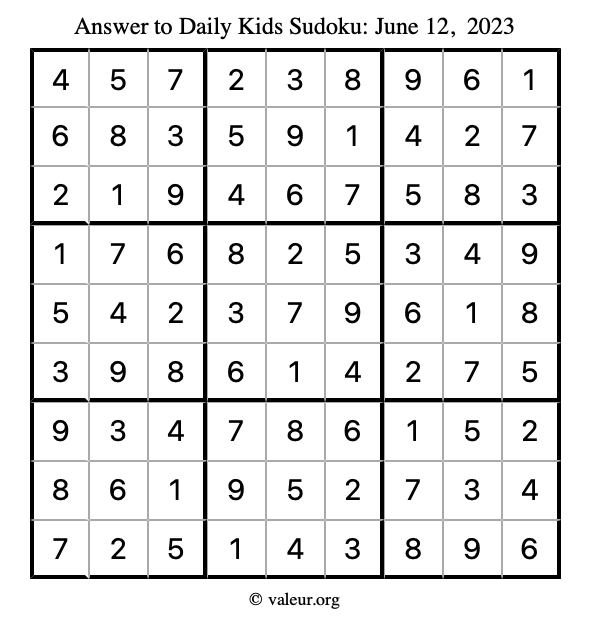 Kids Sudoku June 12, 2023 is not the only sudoku puzzle we have. We create a new kids sudoku puzzle every day for you to print and solve. Check out today's kids sudoku puzzle here!