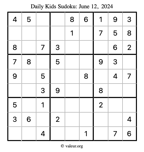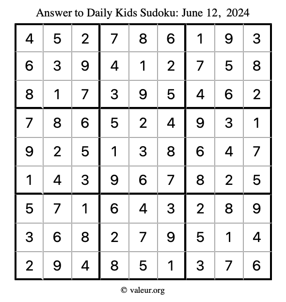 Here is the June 12, 2024 kids sudoku puzzle. You are welcome to print a copy to solve by hand. For your convenience, we have also included the solution further down the page so you can check your work.
