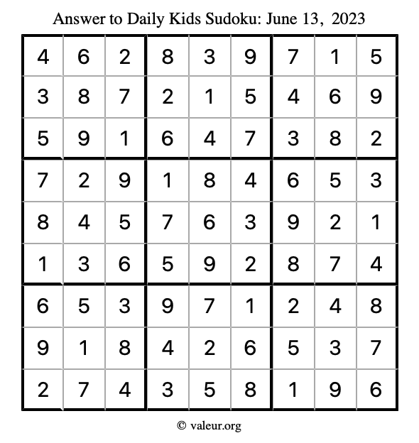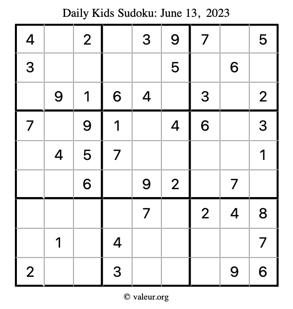 Here is the June 13, 2023 kids sudoku puzzle. You are welcome to print a copy to solve by hand. For your convenience, we have also included the solution further down the page so you can check your work.