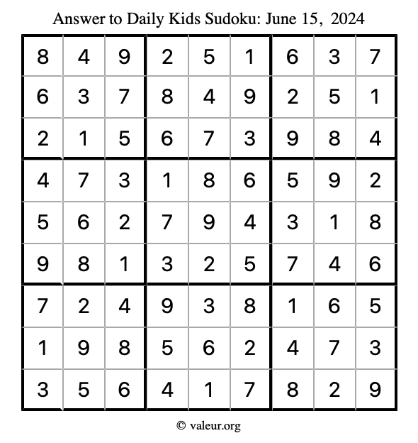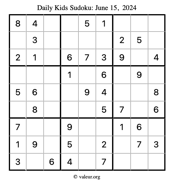 Here is the June 15, 2024 kids sudoku puzzle. You are welcome to print a copy to solve by hand. For your convenience, we have also included the solution further down the page so you can check your work.