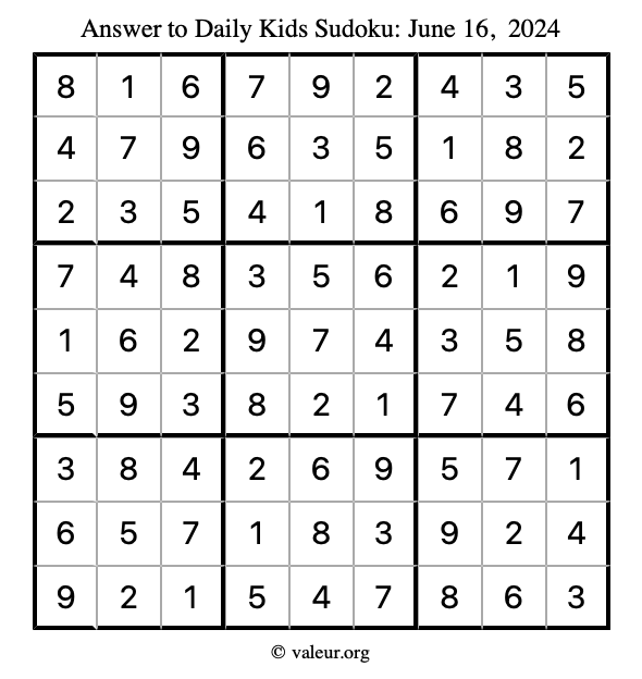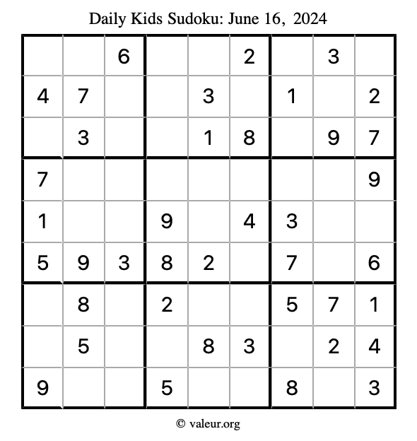 Here is the June 16, 2024 kids sudoku puzzle. You are welcome to print a copy to solve by hand. For your convenience, we have also included the solution further down the page so you can check your work.