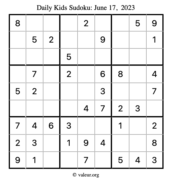 Kids Sudoku June 17, 2023 is not the only sudoku puzzle we have. We create a new kids sudoku puzzle every day for you to print and solve. Check out today's kids sudoku puzzle here!
