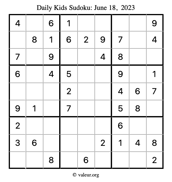 Here is the June 18, 2023 kids sudoku puzzle. You are welcome to print a copy to solve by hand. For your convenience, we have also included the solution further down the page so you can check your work.