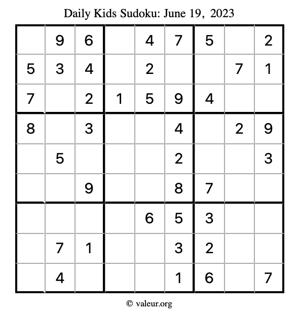Here is the June 19, 2023 kids sudoku puzzle. You are welcome to print a copy to solve by hand. For your convenience, we have also included the solution further down the page so you can check your work.