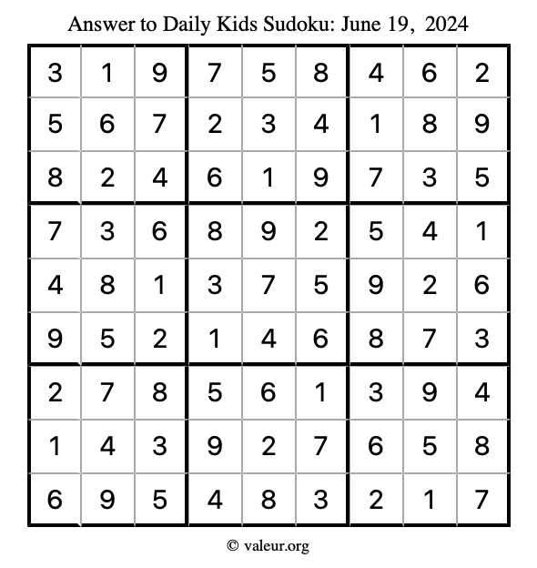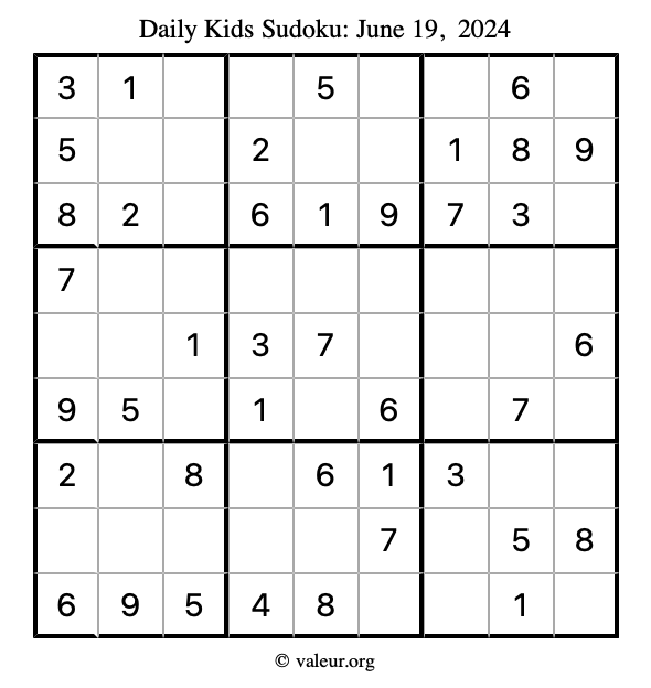 Here is the June 19, 2024 kids sudoku puzzle. You are welcome to print a copy to solve by hand. For your convenience, we have also included the solution further down the page so you can check your work.