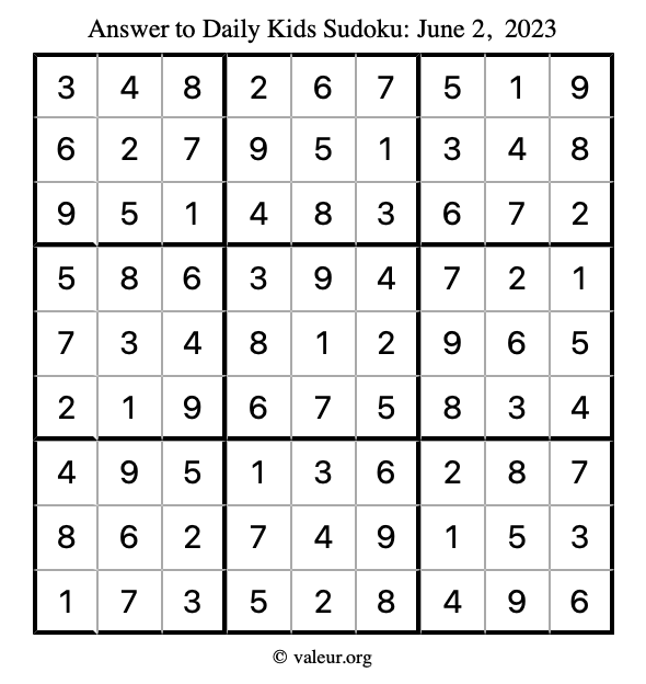 Here is the June 2, 2023 kids sudoku puzzle. You are welcome to print a copy to solve by hand. For your convenience, we have also included the solution further down the page so you can check your work.