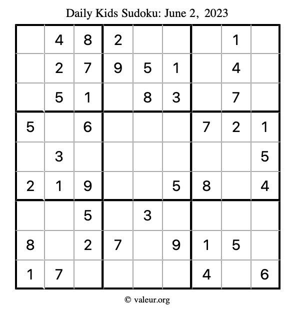 Kids Sudoku June 2, 2023 is not the only sudoku puzzle we have. We create a new kids sudoku puzzle every day for you to print and solve. Check out today's kids sudoku puzzle here!