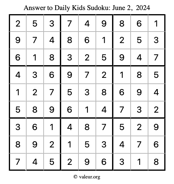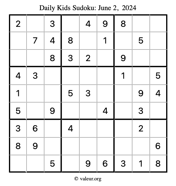 Here is the June 2, 2024 kids sudoku puzzle. You are welcome to print a copy to solve by hand. For your convenience, we have also included the solution further down the page so you can check your work.