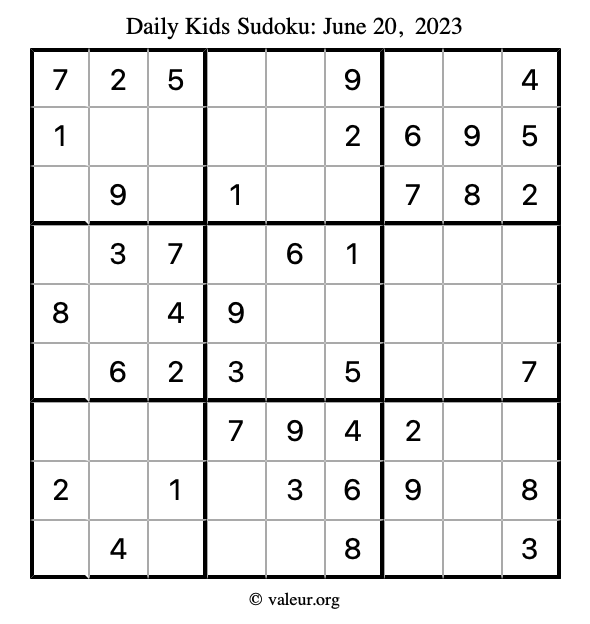 Here is the June 20, 2023 kids sudoku puzzle. You are welcome to print a copy to solve by hand. For your convenience, we have also included the solution further down the page so you can check your work.