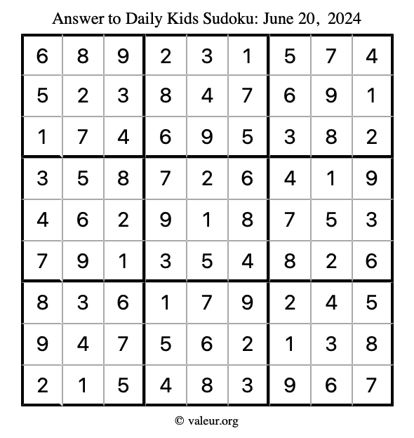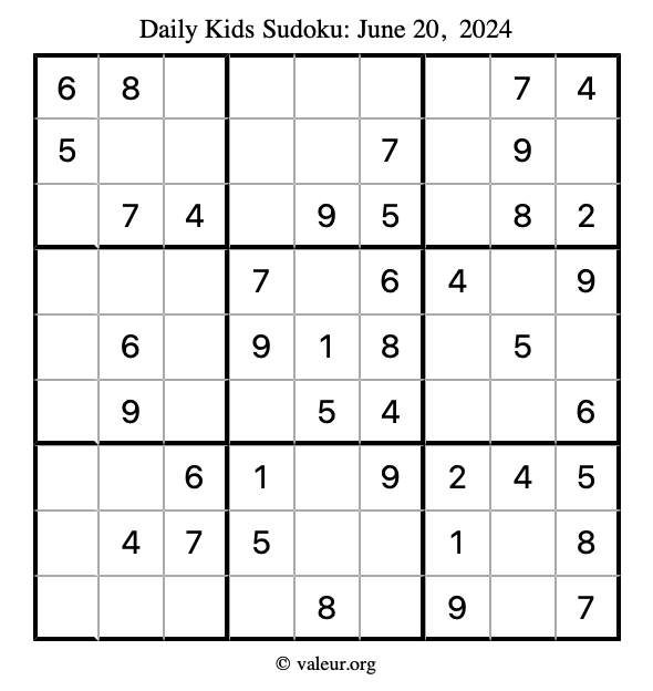 Here is the June 20, 2024 kids sudoku puzzle. You are welcome to print a copy to solve by hand. For your convenience, we have also included the solution further down the page so you can check your work.