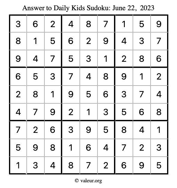 Here is the June 22, 2023 kids sudoku puzzle. You are welcome to print a copy to solve by hand. For your convenience, we have also included the solution further down the page so you can check your work.