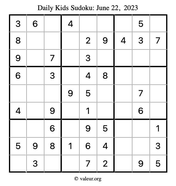 Kids Sudoku June 22, 2023 is not the only sudoku puzzle we have. We create a new kids sudoku puzzle every day for you to print and solve. Check out today's kids sudoku puzzle here!