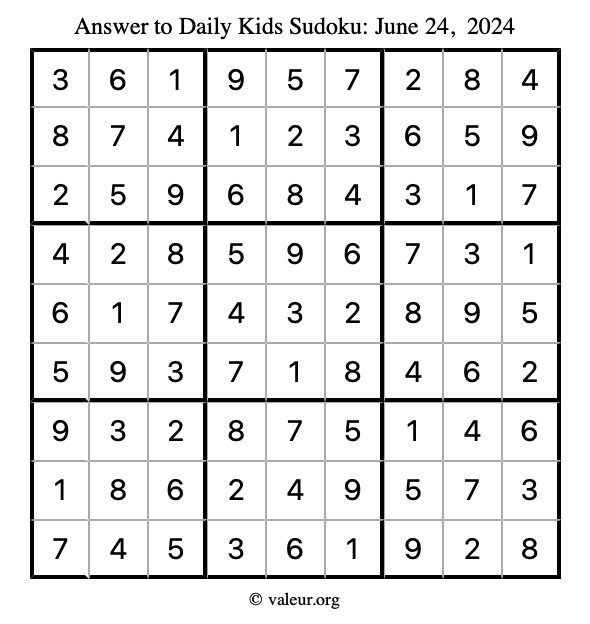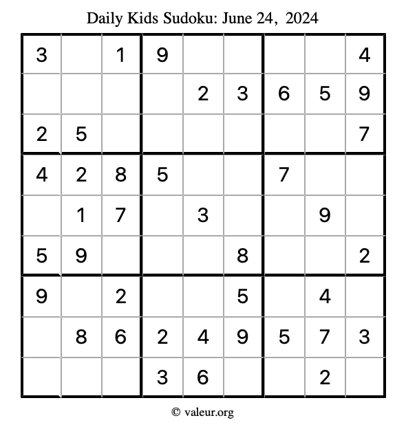 Here is the June 24, 2024 kids sudoku puzzle. You are welcome to print a copy to solve by hand. For your convenience, we have also included the solution further down the page so you can check your work.