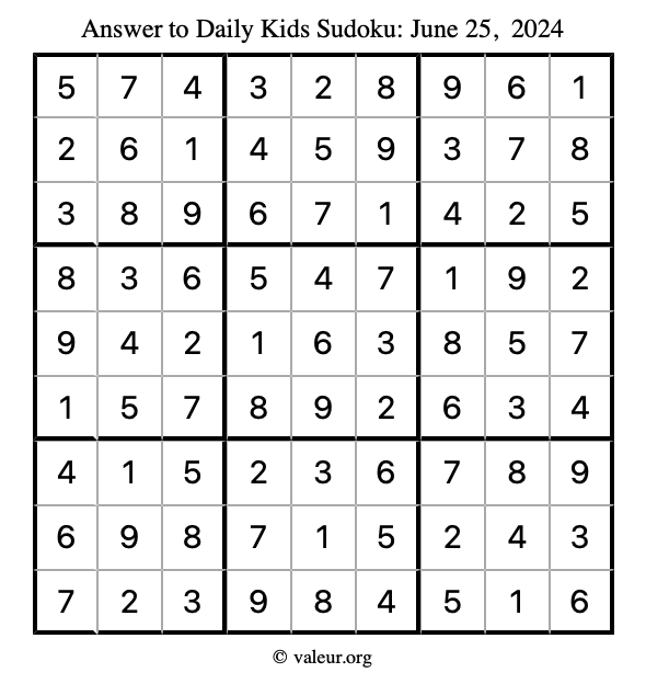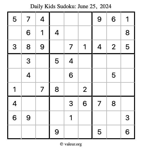 Here is the June 25, 2024 kids sudoku puzzle. You are welcome to print a copy to solve by hand. For your convenience, we have also included the solution further down the page so you can check your work.