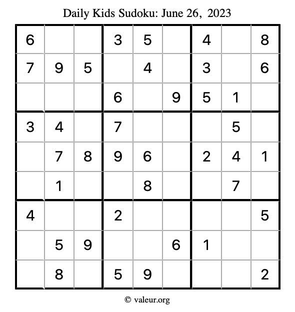 Kids Sudoku June 26, 2023 is not the only sudoku puzzle we have. We create a new kids sudoku puzzle every day for you to print and solve. Check out today's kids sudoku puzzle here!