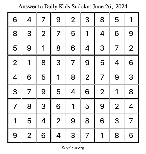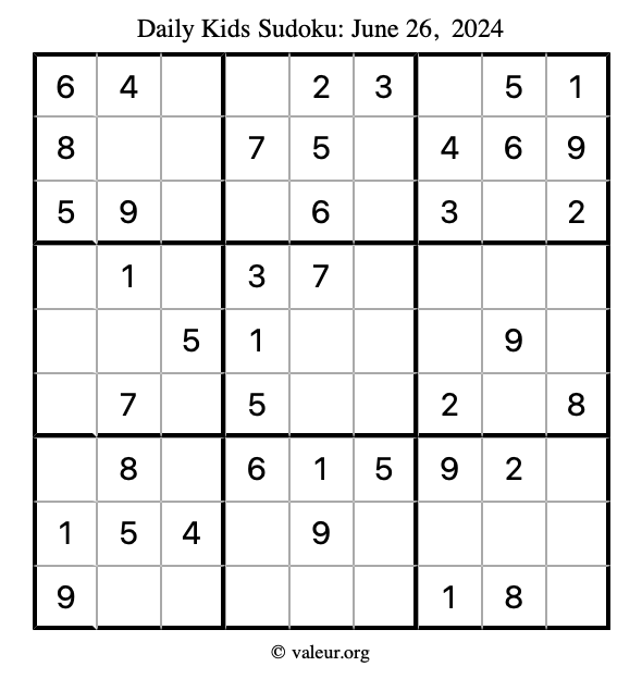 Here is the June 26, 2024 kids sudoku puzzle. You are welcome to print a copy to solve by hand. For your convenience, we have also included the solution further down the page so you can check your work.