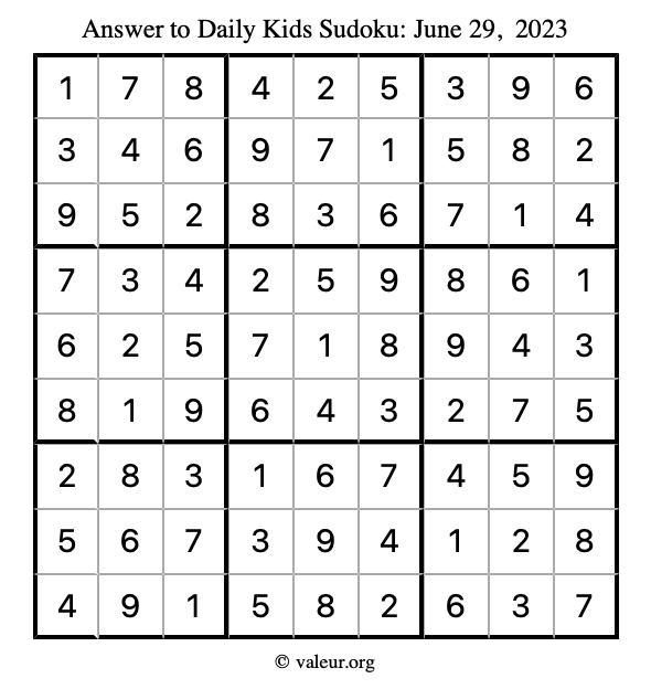 Here is the June 29, 2023 kids sudoku puzzle. You are welcome to print a copy to solve by hand. For your convenience, we have also included the solution further down the page so you can check your work.
